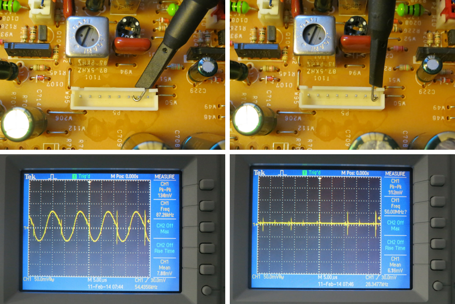 What are the "Erase" Signals: Because I was interested, I hooked up my oscilloscope to the pins on the connector that I just unplugged. I wanted to see what signals where being sent to the erase head. The pictures below show what I found. The connector has 8 pins, and each pair seem to give similar signals (I'd assume that each pair represents a single channel on the 4-track tape). For each pair of pins, one pin showed an 87 kHz signal with an amplitude of ~134 mV RMS. The other pin showed no signal, so it might be ground. I'm assuming that the 87 kHz is the bias signal used by cassette systems as the carrier for real audio signal that is amplitude modulated on that carrier. Since this is the erase head, there should be no audio, so it should just be the 87 kHz signal. This appears to be what I see.