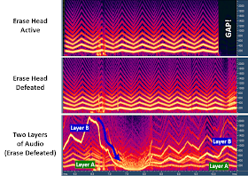 Layering Audio in One Track: Another important effect of defeating the erase head is that nothing clears the track between recordings. So, when you go to record audio onto a track, it becomes layered on top of the audio that was already there. An example of this sound-on-sound recording is given in the third audio demo (and in the third spectrogram above). Here, I first recorded the basic warbling tone from the Monotron as already seen in my other examples. This is "Layer A". Then, onto the same track, I recorded the Monotron with wilder variations in pitch. This is "Layer B". As is clear in the audio demo and in the spectrogram, both layers are clearly there. Note that this is not a mixture that has been done electronically (ie, read the previous track, mix it with the in-coming new audio, then record the mixed audio onto a fresh track). No, this mixture is being done on the tape itself. As far as I know this is very uncommon.