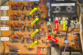DeleteIf I were to put switches (or pots) on my Portastudio, I've already found the connector that goes from the main PCB out to the erase head. That's the connector that I show connected and disconnected in my photos. I could imagine cutting into the cabling that goes between the erase head and main PCB and inserting a four switches to selecting "cut" the wires for a given track.