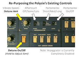 Compare this approach to your more typical 2-oscillator-per-voice monosynth or polysynth. Whether it's an old Minimoog or a Prophet-5, it is my impression that detuning is usually effected by changing the pitch of just the 2nd oscillator while leaving the 1st oscillator at the original pitch. If this is true, it means that the ensemble of the two voices together is always a bit sharp or a bit flat. Since these other synths are wonderful instruments and people love them, this unbalanced detuning must be an acceptable approach...but I've always felt that the detuned sound of the Mono/Poly just felt more "right". So, in adding detuning to the Polysix, I chose to use the balanced detuning approach.